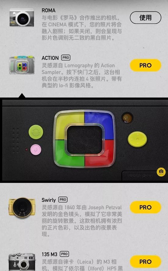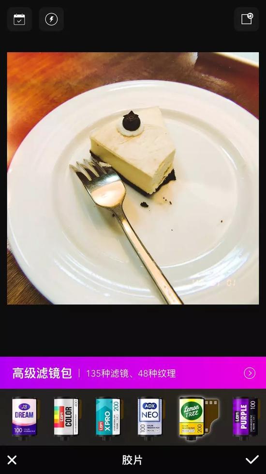 系統(tǒng)自帶很多種膠卷風(fēng)格,拍攝時(shí)可以點(diǎn)擊屏幕左上角,隨意選擇膠片濾鏡。